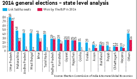 Historically, Indian voters are known to be inconsistent in their voting patterns in state versus general elections. Typically, general election candidates from a state’s ruling party enjoy a greater comparative advantage when general elections are scheduled early in the term as opposed to later; when there is a greater risk from contamination from local anti-incumbency. However, the predictive power of state elections remains unreliable—the rout of the BJP in 2009 came despite a string of state electoral victories in the run-up. A state-level autopsy of the BJP’s 2014 general election victory reveals the crucial role played by its runaway success amongst constituencies in Uttar Pradesh—a state that was then governed by the opposition. Similarly, key inroads made in Maharashtra and Bihar (in 2014) came despite the BJP not being in power in either state assembly.