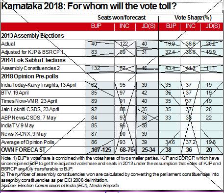 Math behind the forecast Curiously, one very relevant aspect of the Karnataka election has not been emphasised by either the pollsters or the analysts. What we all know is that both BJP and the JDS won 40 seats apiece in the 2013 election, and the Congress won 122 seats. But how many of us know that if the 2013 election is adjusted for BJP “allies”, then the election was indeed very close—83 seats for the BJP to Congress’s 89, and JDS’s 31. In other words, the JDS lost only 9 seats when BJP fought as one unit, and the INC lost 33 seats. Who are these mysterious allies that we have made the adjustment for? Well, none other than former BJP chief minister BS Yeddyurappa who had formed his own party in 2012 (after being thrown out of the BJP) and fought the 2013 election as leader of the KJP (Karnataka Janata Paksha). In addition, Sriramulu, the leader of the small BHRC party, came out in support of the BJP in 2014.