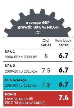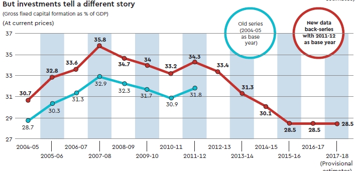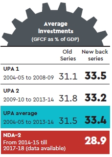 The old numbers show that the average GDP growth of the UPA government (2004-05 to 2013-14) was 7.8%. But the new back-series data show that the economy grew at 6.7% during this period. The current government has clocked an average of 7.4%. However, the reconciliation issue becomes quite stark when it comes to investments.