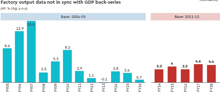 The new back-series data has a lot of reconciliation problems vis-a-vis other indicators. For instance, in 2007-08, GDP grew at 7.7% while investments rate (gross fixed capital formation) was highest at 35.8% of GDP and non-food bank credit grew at 22.4%.