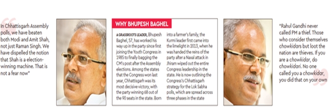 As the Assembly elections got closer, our party president Rahul Gandhi raised the chowkidar slogan for the first time while inaugurating a party office in Chhattisgarh. We kept raising that slogan and also the issue of the Rafale deal. As the elections got nearer, photos of PM Narendra Modi and Amit Shah started shrinking on posters. So we beat both Modi and Shah in the 2018 Assembly elections. We have dispelled the notion that Shah is a election winning machine. That is not a fear now. Last time (in the state polls) we won three-fourths of the seats, this time we will win 100%.