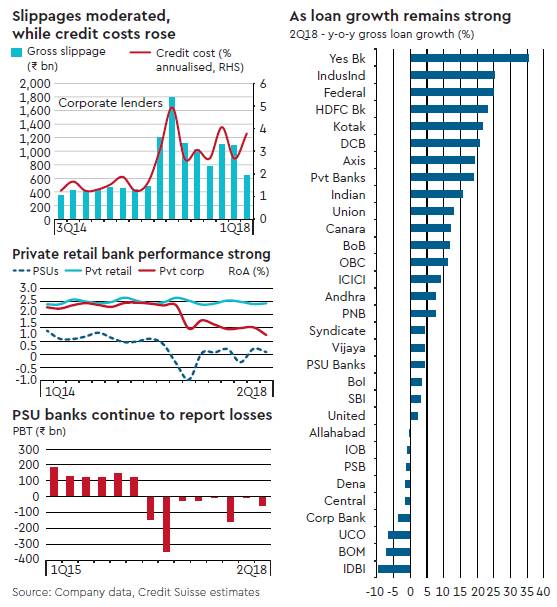 Most banks witnessed a sharp sequential drop in gross slippages. Moderation in slippage was visible in the SME and agriculture segments as well, after the Q1 increase (partly on account of farm loan waivers). Corporate slippage was down at most banks. Corporate banks appear to have accelerated write-offs in H1 (around 100bps of loans) as they wrote off another Rs 330 billion of loans in Q2. PSBs wrote off around Rs 2.8 trillion of loans (5.8% of loans, or around 60% of current PSB capital) over the past four years. Without this, NPAs will be 20-50% higher than the reported NPAs of 8-25%. Axis Bank and ICICI Bank have also written off Rs 50 billion (60bps of loans) in Q2 and Rs 335 billion (4.7% of loans) over the past four years. This high delinquency experience would necessitate high standard asset provisioning, whenever these banks migrate to International Financial Reporting Standards (IFRS).