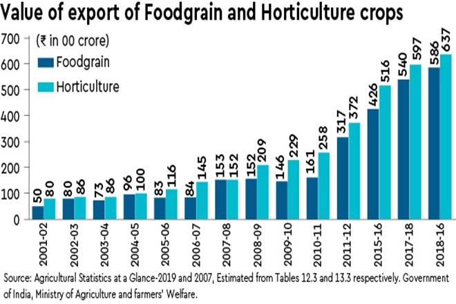 Another important point of note is that share of value of export earnings from horticultural crops has been higher than the export value of total foodgrain. The total export value of horticultural crops includes crops such as spices, cashew, cashew nut shell liquid, fruits-vegetable seeds, fresh fruits, vegetable oil, fresh vegetable, processed vegetable, processed fruits and juice, floriculture products, tea, coffee, Ayush and herbal products, and cocoa products.