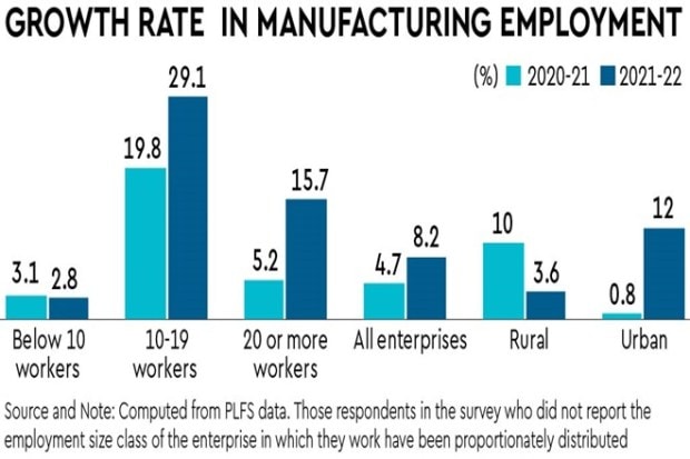 Growth in manufacturing employment during 2020-21 was mostly in rural areas, and during 2021-22, it was mostly in urban areas. With lost job opportunities in the cities because of the pandemic, a large number of reverse migrant workers had no option but to seek a subsistence living by engaging in whatever economic activities they could find. In some cases, this situation might have led to work-sharing in own account industrial enterprises in rural areas. Therefore, the rapid growth in manufacturing employment in rural areas in 2020-21 might partially reflect this phenomenon. But, there were possibly other strong forces which caused large increases in manufacturing employment in 2020-21 and 2021-22.