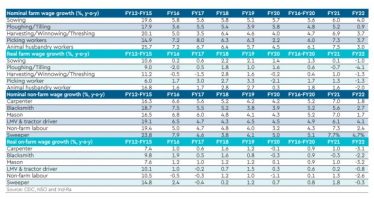 For a major agricultural occupation like sowing, the nominal wage growth was as high as 30.7% in FY13 but dropped to 5.6% during FY16-FY20 and declined further to 4% in FY22. The nominal wage growth rates for animal husbandry workers were also consistently strong (20.4-34.8%) till FY15, but dropped to an average of 6.1% during FY16-FY20 and to 3% in FY22.