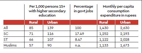 Economic justice is an offspring of social justice. The neglected and disadvantaged groups have lower educational attainments, less property, fewer government or quality jobs and lower incomes/expenditure, as the numbers in the table (above) illustrate: