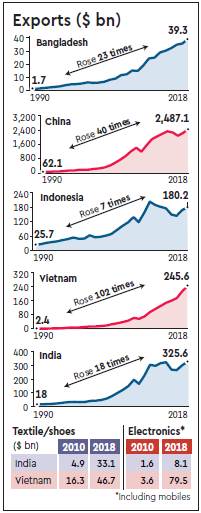 Even China, whose exports are 7.5 times India’s, managed to grow at 1.5% per year in 2014-18; Vietnam, which is rapidly emerging as an export powerhouse, taking up the slack in markets being vacated by China, managed to grow by a whopping 13% per year, from $150.2 bn in 2014 to $245.6 bn in 2018. As a result of this sustained growth, Vietnam’s exports, which were a mere 6% of India’s in 1960 and 13% in 1990, managed to reach 34% in 2000 and a whopping 75% in 2018; at this rate, within a few years, they could even outstrip India.