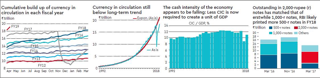 As noted above, if we are to base an inference on past trends, the system might be notionally short of about Rs 3 trillion of cash. Adjusting for estimated transactions multipliers and the growth in economic activity, the rise in digital transactions (via NEFT, wallets, cards, UPI and other channels) might have compensated for a large part of this notional deficit, since transaction amounts using these instruments and channels have indeed risen.