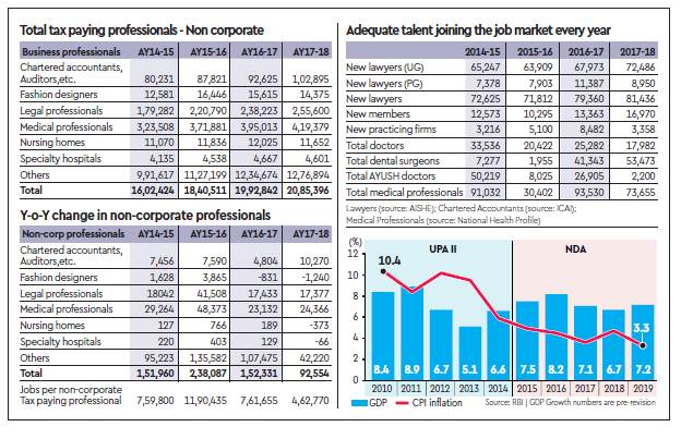 The attached graphic shows the incremental increase in taxpayers every year. It is possible that they were working earlier and they then came into the tax bracket this year. However, this is an annual feature with a continuing pipeline and, hence, it normalises over time. We estimate that the professional sector alone has created around 4 million jobs from 2014-15 to 2018-19 (last year numbers are estimated). Taking the jobs that we estimate from the transport sector—14 million over a similar time period—we can easily estimate a total of 18 million jobs were created in this period. We also cross-verified the annual flow of professional talent from our universities and professional entities to make sure that there was adequate talent joining the job market every year. Of course, very many will join corporate employers and come into the social security net, but large numbers will join professions too.