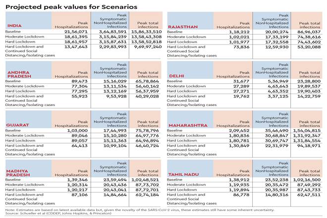 Researchers associated with the Center for Disease Dynamics, Economics & Policy (CDDEP), Johns Hopkins University and Princeton University project peak COVID-19 infections in the country at 15.9 crore, against 13.6 crore each in the hard and moderate lockdown scenario and 9.7 crore in a hard lockdown + continued social distancing/isolating cases scenario. The underlying assumption is that the 21-day lockdown that started March 25 was a hard lockdown in which the transmission rate (R0) was pushed down to 1.5 (i.e. each infected individual infects 1.5 others) from an R0 of 2.66 in the baseline scenario of no lockdown, no social distancing and other interventions, or a moderate lockdown that pushed down R0 to 2.