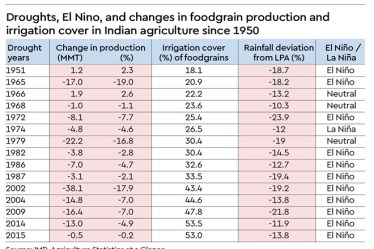 It may be noted from the table that droughts of 1965, 1979, and 2002 have been the most damaging ones in terms of drop in foodgrain production in percentage terms over previous years. But the 2002 drought saw the maximum drop in absolute amount of 38 million tonnes (mt). However, the subsequent droughts have been much milder. For example, the 2014 drought led to a drop of only 13mt of foodgrain production, which was just 4.9% over the previous year. The extent of damage obviously depends on the intensity of drought. But as irrigation cover for foodgrains has been increasing over years, from 18%in 1951 to 53%in 2015, it can provide some resilience to foodgrain production against droughts.