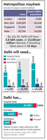 As in the case of Mumbai, the gaps in hospital infrastructure will show up quite quickly. Less than halfway to the 2.8 lakh number, when infections are at 6,000 cases per million, Delhi will need 19,000 hospital beds for the infected (assuming half the cases are ‘active’ and a hospitalisation rate of 30%); assuming all non-Covid patients are thrown out of hospitals, government hospitals have enough beds to meet the rush. At 10,000 cases per million, however, the government beds run out along with the 20% private beds that have been requisitioned so far; the ICU beds fall short at even 6,000 cases per million.