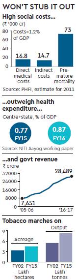 The costs cited in the PIL are a bit dated, but nonetheless staggering. In 2011, estimates were the costs of tobacco-related health issues, including the death of more than 10 lakh people a year—that’s one person every 30 seconds—added up to over Rs 1,00,000 crore, or 1.2% of GDP in that year. To put this in perspective, between the Centre and the state governments, India spends around 0.9% of GDP on all manner of health issues, not just those related to tobacco. So, it’s clearly a losing battle. To the extent, the government is trying to fix the problem by taxing users, it applies to only cigarettes which account for a small fraction of tobacco use. While cigarettes pay an excise duty of around 50%, bidis get taxed at around 2-3% and chewing tobacco pays around 5-6%—VAT rates differ from state to state, but are roughly 26% for cigarettes and 8-10% for bidis and chewing tobacco. As a result, while the share of cigarettes in total consumption of tobacco has halved from around 20% in the early 1980s, there has been little drop in overall consumption. And for all the talk of trying to discourage tobacco, the acreage under it has risen from 3.5 lakh hectares across the country in 2001-02 to around 5 lakh hectares today and, production is up from 5.5 lakh tonnes to 8.4 lakh tonnes—whenever any tough action is sought, the millions of farmers are brought up as a convenient shield.