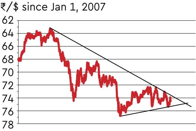 I have learned from several decades of writing columns that it is quite exciting—from time to time—to put out a highly controversial headline, as today. But looking to the rupee’s recent performance and, critically, the increasing noise surrounding moves towards getting Indian government bonds incorporated into global bond indices, it is a question worth thinking about. The accompanying chart shows that over the last 400 trading days or so (since about June last year), the rupee’s lows have been rising—the lower line. To be sure, there have been occasional periods when this has happened in the past, but the rising tide has only been longer than today’s once before—in early 2009, when the rupee rallied for 600 trading days.