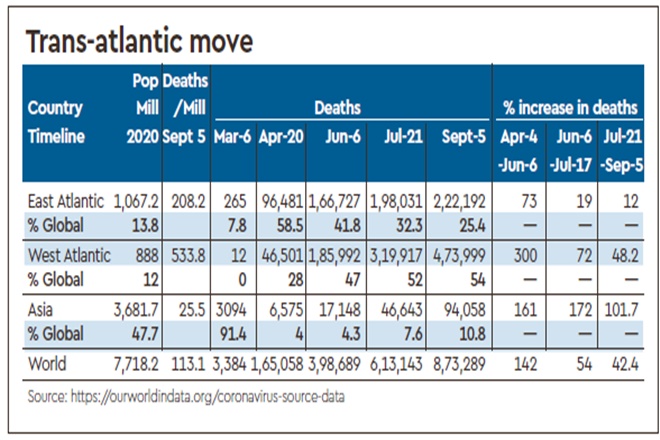 The data updated to September 5 shows that the pandemic continues its uneven retreat, with four notable exceptions. The Covid axis has continued its westward march and is currently centred on the Western Atlantic. North and South America, with just 12% of the global population, now account for 54% of Covid-related deaths. If the legacy deaths in Europe are included, 23 major countries in the Americas and Europe (the transatlantic region), which together constitute a quarter of the global population, account for 80% of deaths to date. Eight countries in Asia, with 47.7% of the global population, account for just 10.8% of Covid deaths.