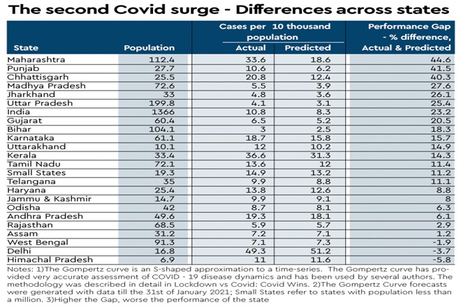 We report in the accompanying graphic a detailed analysis of all the large states in India, as well as an aggregation of small states. Actual cases (per ten thousand population) are reported in the second column. The Gompertz estimate (model estimated till January 31, 2021, to allow for out of sample forecasts assessment) is reported in the third column. The final column reports the percentage difference in the two. A priori, one would expect that the states which relaxed too early (letting activity happen) and/or states which held super-spreader events like election rallies, should have the largest deviation from what would be expected. In other words, states like West Bengal and Assam (especially the former) should have a massive uptick in “surprise” infections—the surprise being an excess over what was expected before the rallies, i.e., the percentage gap between actual and predicted cases.