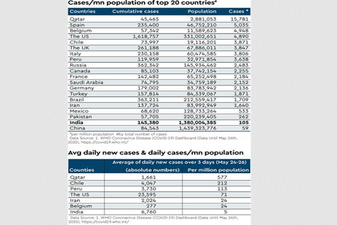 A May 28 report on India’s Covid-19 situation in BBC’s net version states in bold: “India is now among the top 10 countries worldwide in terms of total reported infections, and among the top five in the number of new cases”. This comparative ranking of countries, showing India’s rise in the international league table of total cases and daily new cases has also been raised prominently by several Indian media channels.
