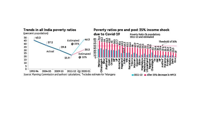 Using the same method for all states and UTs, we find that with the 25% shock to incomes across all fractiles: (i) India’s overall poverty rate rises to 46.3%, i.e., more than twice the 2011-12 levels, and higher than even the 1993-94 levels (see graphic); and (ii) this means that India will have an additional 354 million poor, taking the total count of the country’s poor to about 623 million.