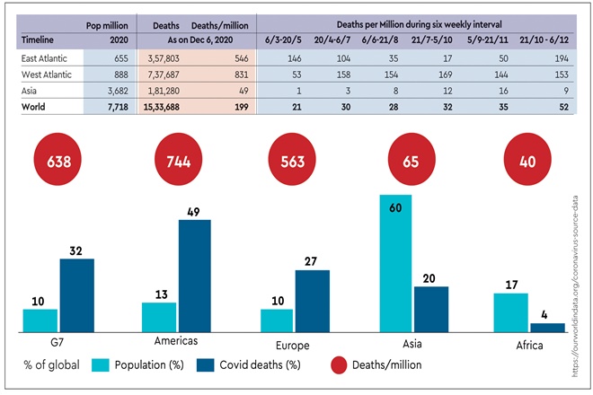 Covid-19 mortality in deaths per million (to control for population differences) has been aggregated through snapshots taken at six-week intervals beginning March 6, 2020, to track the spread and intensity of the pandemic across space and time (see table). Data for 27 major countries has been classified into the East Atlantic, West Atlantic and South and East Asia—these countries together account for 68% of the global population and 83% of all Covid-19 deaths.