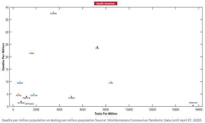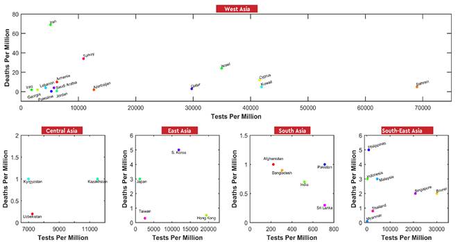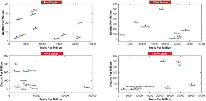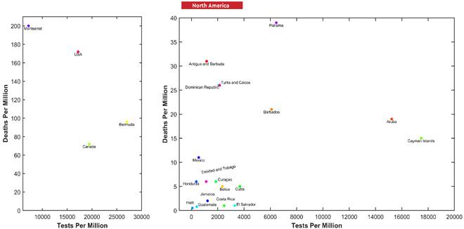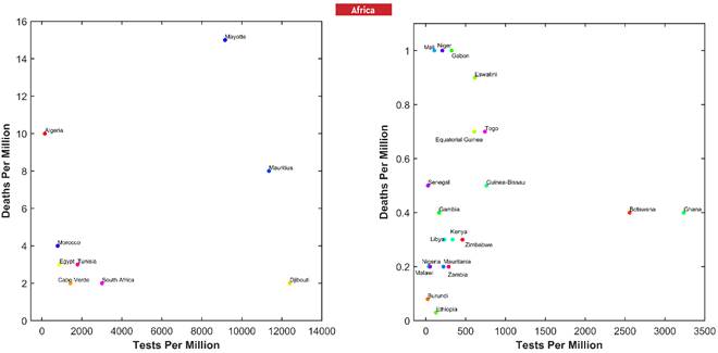 In this context, we regard the most important question to be whether high testing rates are associated with lower death rates. Reduced mortality is the ultimate objective of our response to the Covid-19 epidemic. To answer this, we examined the relationship of tests per million and deaths per million in a number of countries grouped into geographic zones (see graphics). There was no relationship between testing rates and mortality rates in any region. Even on taking all countries together, there is no correlation to suggest that high testing rates are associated with lower mortality.