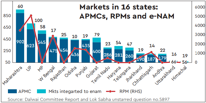 As per the Dalwai Committee Report 2017-18 (Volume IV), there are close to 29,547 marketing points. Of these, 22% or 6,615, are regulated markets under the APMC and 22,932 are regional periodical markets (RPMs). On an average, a farmer gets a regulated market in the radius of about 12 km and a RPM in a radius of about 7 kms. Out of these 6,615 markets, the NAM scheme aimed to bring 585 markets (i.e. 9%) on its e-market platform by the end of financial year 2017-18. Quite commendably, as on March 2018, all targeted mandis, i.e., 585 that are in 16 states and 2 UTs, (Chandigarh and Puducherry), have been integrated with the NAM-platform.