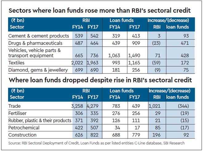 Let us now come back to table 2. For example, in respect of sub-segment trade through FY14-17, we observe that while loan funds outstanding of listed entities declined, RBI credit deployment numbers depict growth. From this, we possibly infer that credit deployment has moved away from listed corporates to unlisted entities/unorganised, possibly, retail trade. Similarly, in construction we infer the same, as can be seen from table 2. There may be other sectors too, but for want of clarification on classification of sector by RBI and our listed database, this exercise may only be read as a fleeting review.