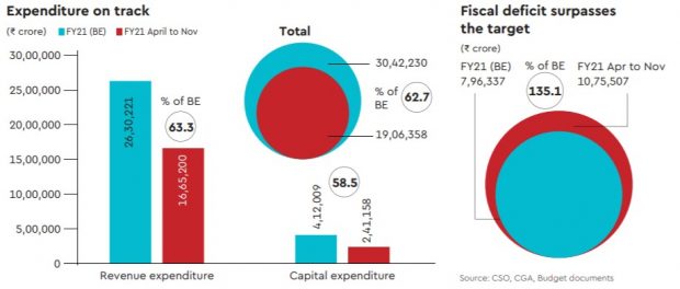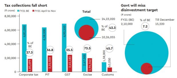 The FY21 Union Budget will be challenging as the economy is likely to contract 7.7% in FY21, for the first time in 41 years; tax collections and proceeds are likely to fall short of the target. The Budget for FY21 had estimated tax collection of Rs 24.23 lakh crore and apportioned Rs 2.1 lakh crore from disinvestment. However, data from Controller General of Accounts show total tax collection for FY21 till November was just Rs 10.26 lakh crore – 42% of the budget estimates. Within direct tax, corporate tax collection has been just 27% of Rs 1.86 lakh crore of Rs 6.8 lakh crore estimated in the budget. Personal income tax collection at Rs 2.35 lakh crore has been around 37%. Goods and services tax collection is around 36%. Notably, collection from Union excise duties has been Rs 1.96 lakh crore, which is around 75% of the budget estimates. The mop-up from disinvestment in recent years has been low as sales have proven difficult. Till December 2020, the government could raise only Rs 15,220 crore out of the Rs 2.1 lakh crore target. The government will have to go for a massive asset-monetisation drive to raise funds for investment in infrastructure.