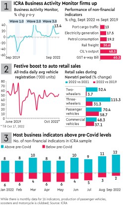 The ICRA business activity monitor, an index of high-frequency economic indicators, firmed up to 13.4% in September from 11.4% in August, given economic and business activities gained momentum as companies embarked on pre-festive stocking.