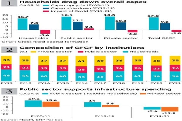 While the household sector dragged down overall capex—its contribution fell sharply from 46% in FY12 to 39% in FY21—the public sector has stayed relatively strong over the past decade and during the Covid-pandemic.