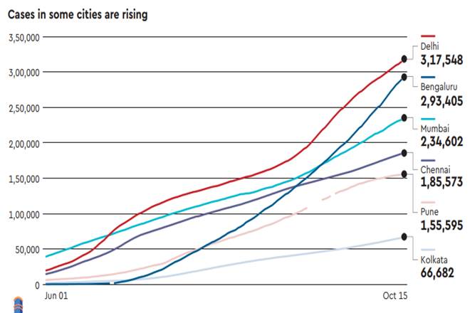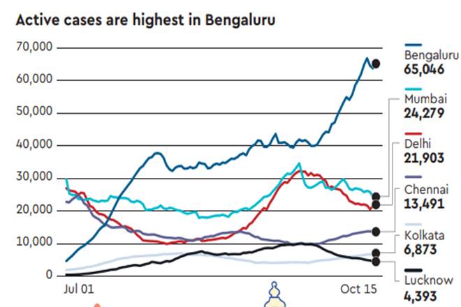 On Saturday, Bengaluru will become the second city in India to cross 3 lakh cases. While Bengaluru had surpassed Mumbai last month, it will soon surpass Delhi to become the most corona-infected city in the country. Data shows that, starting October, Bengaluru became India’s top city in terms of growth in daily cases. For the first fortnight of October, cases in Bengaluru grew at a daily rate of 1.1%, Delhi, meanwhile, had a growth rate of 0.7%. Bengaluru also leads the country in terms of active infections. In two months, Bengaluru’s active infections have nearly doubled. On August 14, Bengaluru had 33,433 active case; this increased to 40,528 on September 14. On October 15, Bengaluru had 65,046 infections.