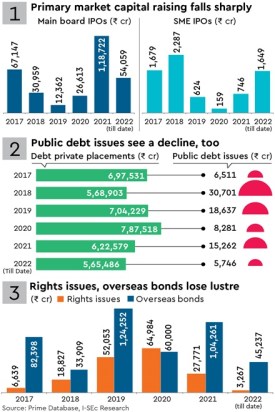 Capital market issuances have dropped by more than half this year, as companies have raised just Rs 55,708 crore through initial public offerings (IPOs) till date, compared with Rs 1.19 trillion in 2021; this is mostly because the markets have stayed volatile.