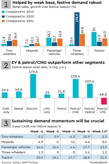The festive-season trend underscores strong passenger vehicle demand and raises hopes of a two-wheeler and tractor demand recovery.