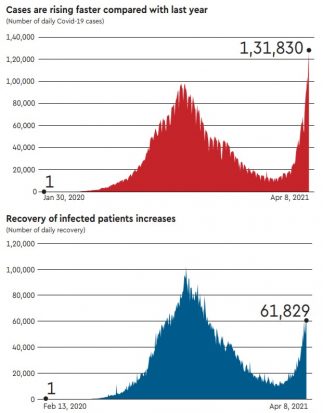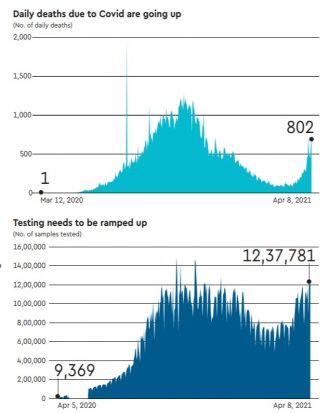 While the second wave of the Covid-19 pandemic in the country is spreading faster than the first, vaccination has been progressing at a slow speed. Initially concentrated in Maharashtra, new cases are rising in other states. Many states have imposed night curfew, which has affected mobility and will impact the nascent economic recovery. The daily new cases crossed last year’s peak, which has also led to an increase in the case-load. India has been reporting the highest daily cases of the virus over the past few days, and the country’s total cases crossed 13 million with the last 1 million cases coming in just 11 days. The state governments must ramp up testing and contact tracing, and enforce Covid-safe behaviour which helped the country fight the first wave.