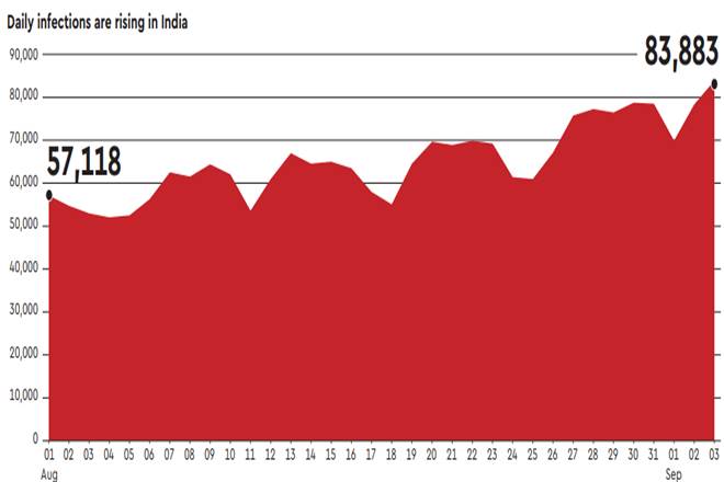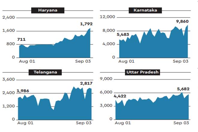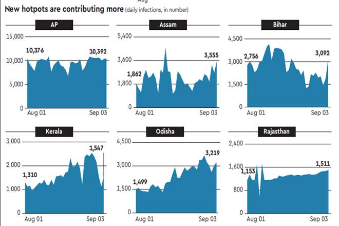 While Maharashtra still accounts for a fifth of India’s cases, the share of states like Andhra Pradesh and Karnataka in India’s total infections has increased from 9.2% and 7.6%, respectively, a month ago to 11.8% and 9.4%.