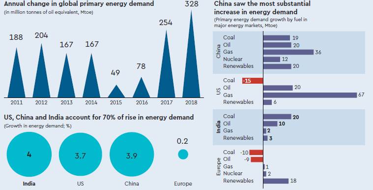 The report says India saw primary energy demand increase 4% or over 35 million tonnes of oil equivalent (Mtoe), accounting for 11% of global growth, the third-largest share. Growth in India was led by coal (for power generation) and oil (for transport), the first and second biggest contributors to energy demand growth, respectively.