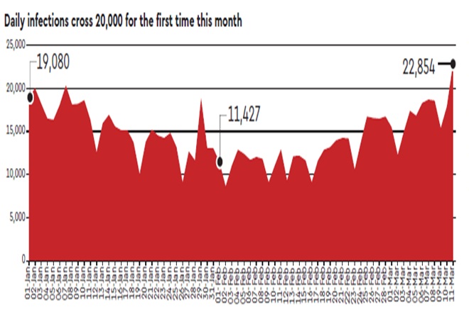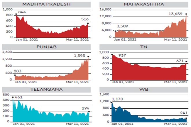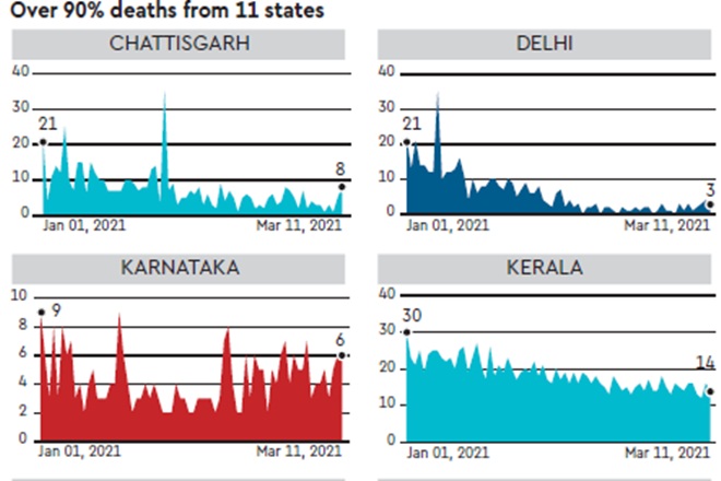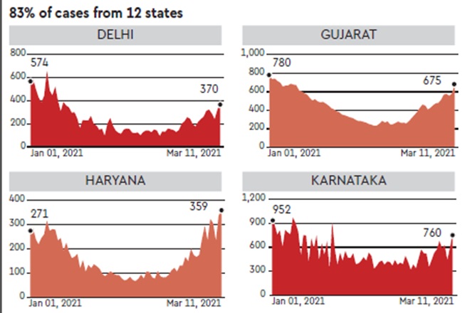 On Friday, India recorded 23,285 new Covid-19 cases, as cases in most parts of the country started rising. While Maharashtra accounts for a majority of the infections, cases in Delhi, Punjab and Karnataka have also been rising. Now, 12 states account for 83% of India’s cases, with Maharashtra, Kerala and Punjab all recording over 1,000 infections daily. While deaths have been rising as well, the rise is not as sharp as the rise in cases. Moreover, over 90% of the deaths in the country have been recorded in 11 states.