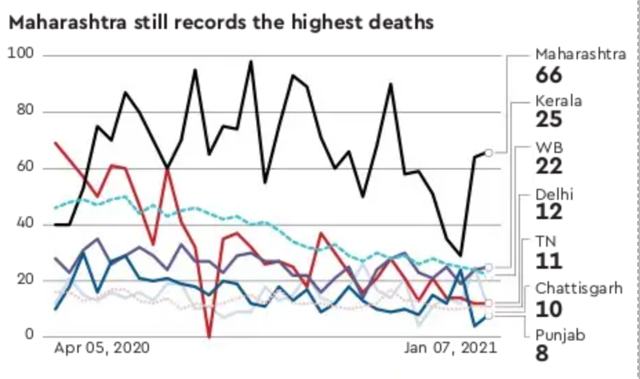 Maharashtra, with 66 daily deaths, had the highest tally amongst all states, followed by West Bengal and Kerala.