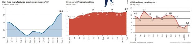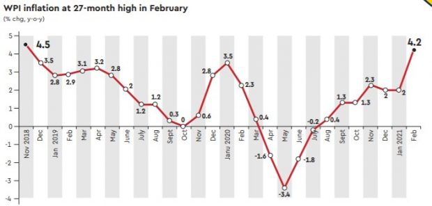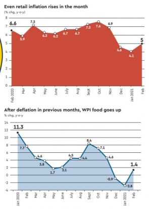 In WPI, while primary food articles saw inflation of 1.3% y-o-y in February as compared to -2.8% in January, inflation in manufactured food products stood at a 13-month high of 7.1% y-o-y, against 4.8% y-o-y in January. Wholesale inflation manufactured products posted the highest inflation since the new series began in 2012 – 5.8% y-o-y in February, as compared with 5.1% in January.