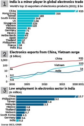 With insufficient production of electronic goods, four-fifths of India’s domestic demand is met by imports. While China’s exports of electronic products have surged from $44 billion in 2000 to over $900 billion in 2021, Vietnam’s case is the most striking; India and Vietnam had similar levels of exports two decades ago.