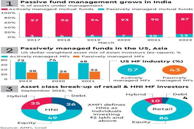 With inflows from institutional investors such as Employees’ Provident Fund Organisation, the share of passive funds in the total assets under management of mutual funds grew to 13% in March 2022, as compared with 3% in March 2017.