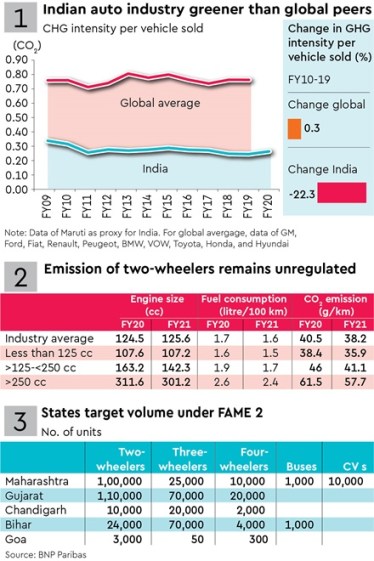The Indian automobile industry has made its manufacturing less emission-intensive in the last decade, compared to global peers, a new report by BNP Paribas shows.