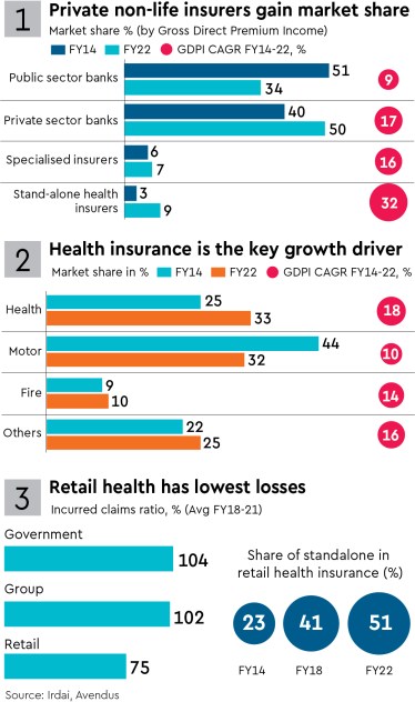 Health insurance is driving growth within non-life insurance because of rising medical inflation, under-insurance, and awareness post-Covid. Existing retail health insurance schemes cover only 4% of the country’s population, while 26% is covered under government schemes and 10% under group policies–the rest of the population has no cover. And only 15% of the hospitals’ total in-patient revenue is covered by health insurance. In non-life insurance, private and standalone health insurers have gained significant market share at the expense of public sector insurers.