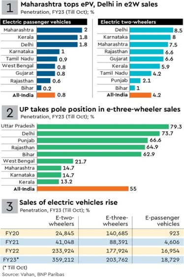 The electric passenger vehicle volume grew 160% year-on-year in October, with Kerala seeing the fastest month-on-month growth. Delhi had a significant improvement in penetration to 1.8% in FY23 (till October) from 0.4% in FY22.