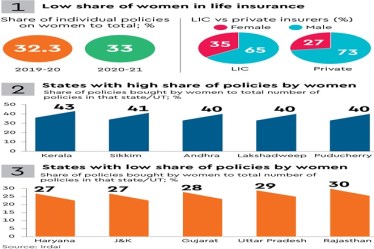While the total number of individual life insurance policies sold in 2020-21 was 2.81 crore, the number of policies bought by women was 93 lakh, accounting for just a 33% share.