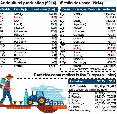 Of the 3.52 million tonnes of pesticides (active ingredient) used in the world, the highest consuming regions are China, the US, EU, Brazil and Argentina. Together, they account for 90% of the pesticides used, globally. Even though India has the largest area (141 million hectares) under agricultural crops and is the second-largest agricultural producer ($367 billion) in the world, it accounts for just 1.7% of the global pesticides use. Compare that to the EU, which accounts for more than 11% of the global pesticides use, and uses 600% more pesticides than India does. In fact, many countries in the EU, like Spain, France and Italy, which have a much smaller area under agriculture and produce much less when compared to India, use far more pesticides.