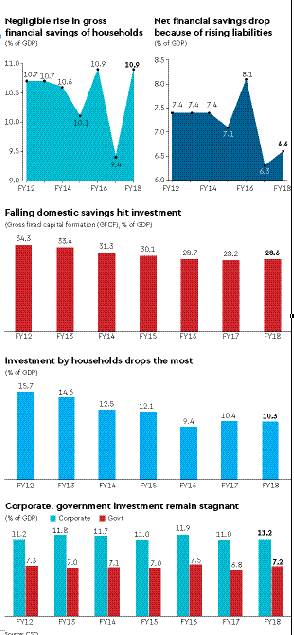 Investment by households has fallen from 15.7% of GDP in FY12 to 10.3% in FY18 and the share of households in capital formation has slipped from 45.9% of GDP in FY12 to 35.8% in FY18. As household savings are a major source of funding investment in the economy, the declining trends seen after the twin policy shock of demonetisation and implementation of goods and services tax coupled with rising liabilities will pose a serious challenge to investment and employment generation.