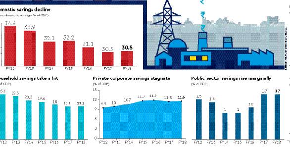 The declining trend of household savings from a high 25.6% of GDP in FY10 to 18% in FY16, 17.1% in FY17 and 17.2% in FY18 has affected overall investment, which has dropped from 34.3% of GDP in FY12 to 28.7% in FY16, 28.2% in FY17 and 28.6% in FY18.