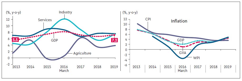 FY19 GDP growth is expected at 7.2%, and the underlying measure of economic activity, gross value added (GVA, which we think is the better measure of economic activity), is estimated at 7%. This was the market consensus, and our own forecast as well. For us, though, our internals were wrong; the actual manufacturing sector growth was lower than expected, but higher construction segment sector growth offset that, balancing each other out. Trends in the three main components of GDP growth—agriculture, industry and services—are shown in the attached graphic. While services have been the most consistent contributor to growth, industry, particularly manufacturing, seems to be reviving in FY19.