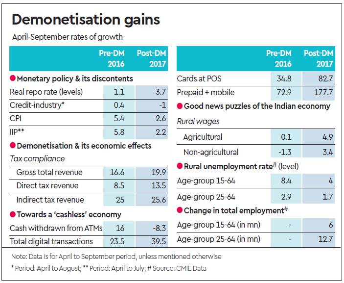 Today is the first anniversary of an unprecedented and bold political and economic experiment—demonetisation (DM). Nobel laureates are cited to suggest that this was an uncalled for, unneeded, and unnecessary experiment—one with magnificent costs and precious little benefits. Most economists, left and right, have argued that DM was a costly, and ineffective, exercise. Given this convergence, some have declared that there is no debate on the efficacy of DM—an economic version of “Jab miya bibi raazi to kya karega kazi.” Impeccable logic which can only be proved wrong by empirics. As far back as November 19, eleven days after D-Day, in an FE column entitled “Demonetisation: Big Bang, or Big Thud?” (https://goo.gl/ui3ygB) I argued that increased tax compliance was the most important metric to judge the success or failure of DM. Curiously, but not at all surprisingly, political anchors who want to berate DM will mention everything in their fertile imagination to pronounce DM as demonic, but will not utter a single word about tax compliance. Fake news, and flaky analysis was discovered in India considerably earlier than that in the US on D-Day 2016. Let us now talk evidence. The accompanying table documents various aspects of the Indian economy pre-and post-DM. The post-DM period is April to September 2017; the pre-DM period is the same period last year. Some data (for example, CMIE data on employment) are only available till August, and for such data the comparison is with January-August last year.