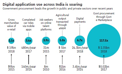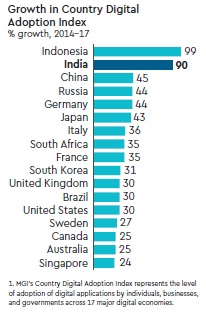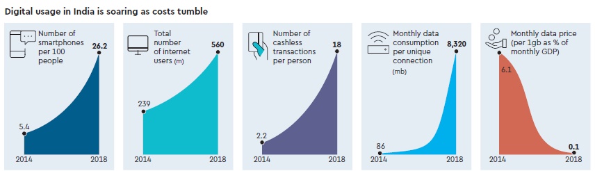 India is one of the largest and fastest-growing markets for digital consumers, with 560 million internet subscribers in 2018, second only to China. A study by McKinsey Global Institute says that digital applications could proliferate across most sectors of economy. By 2025, core digital sectors such as IT and business process management, digital communication services, and electronics manufacturing could double their GDP level to $355 billion to $435 billion.